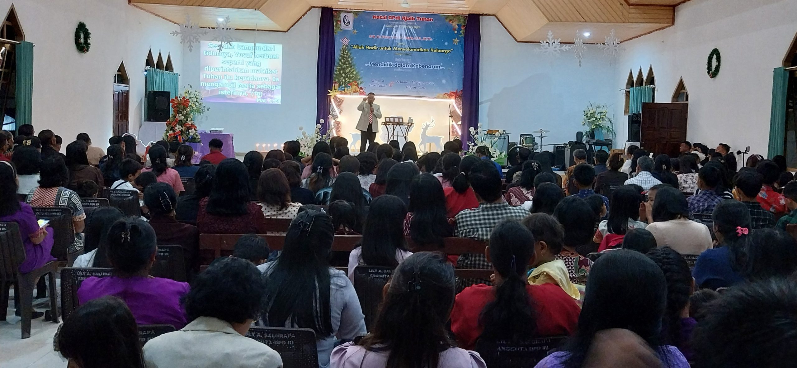 Dalam ibadah natal tersebut Pdt. Dr. Ferry Rope, S.Pt,M.Th. diberikan kepercayakan menyampaikan Firman Tuhan, yang disesuaikan dengan tema “Allah hadir untuk menyelamatkan keluarga”.